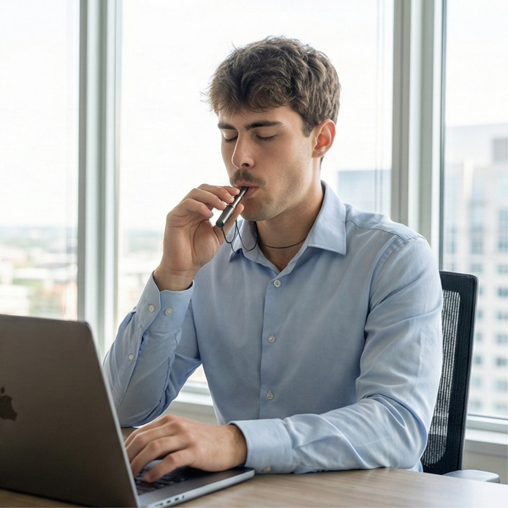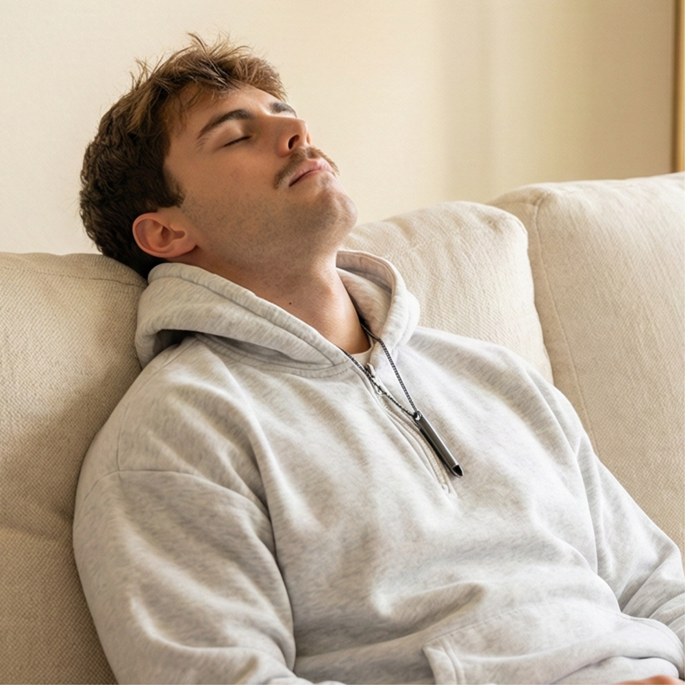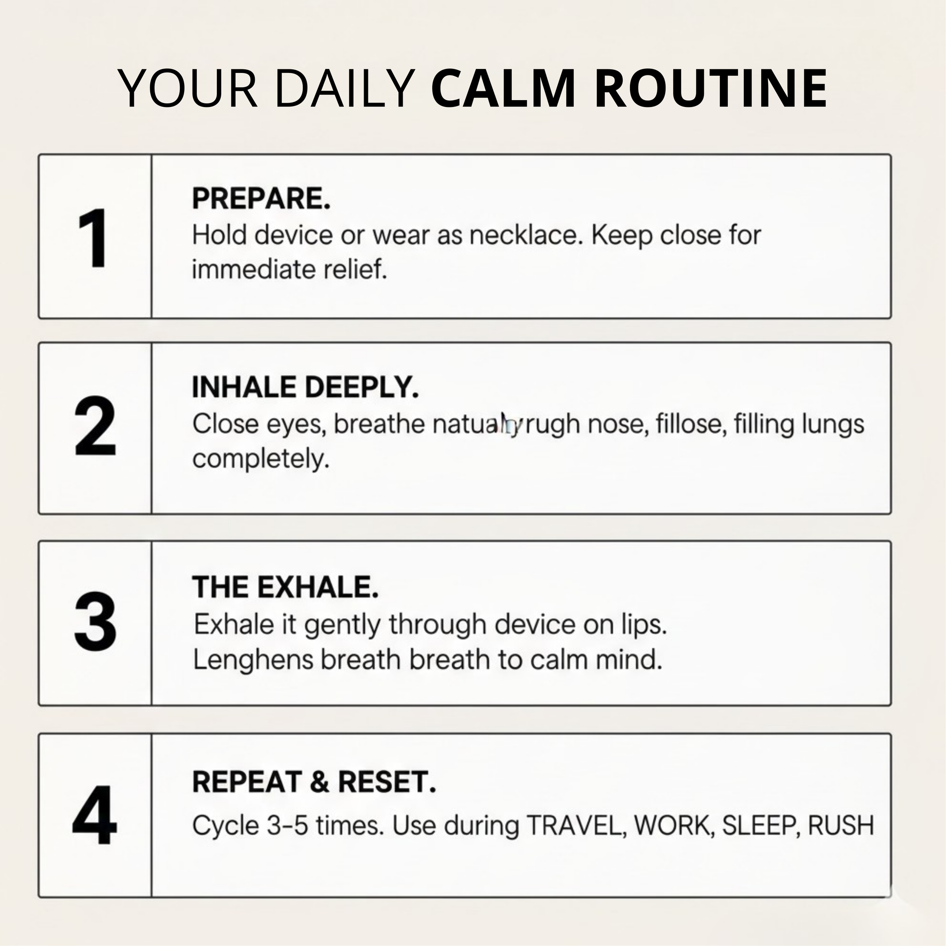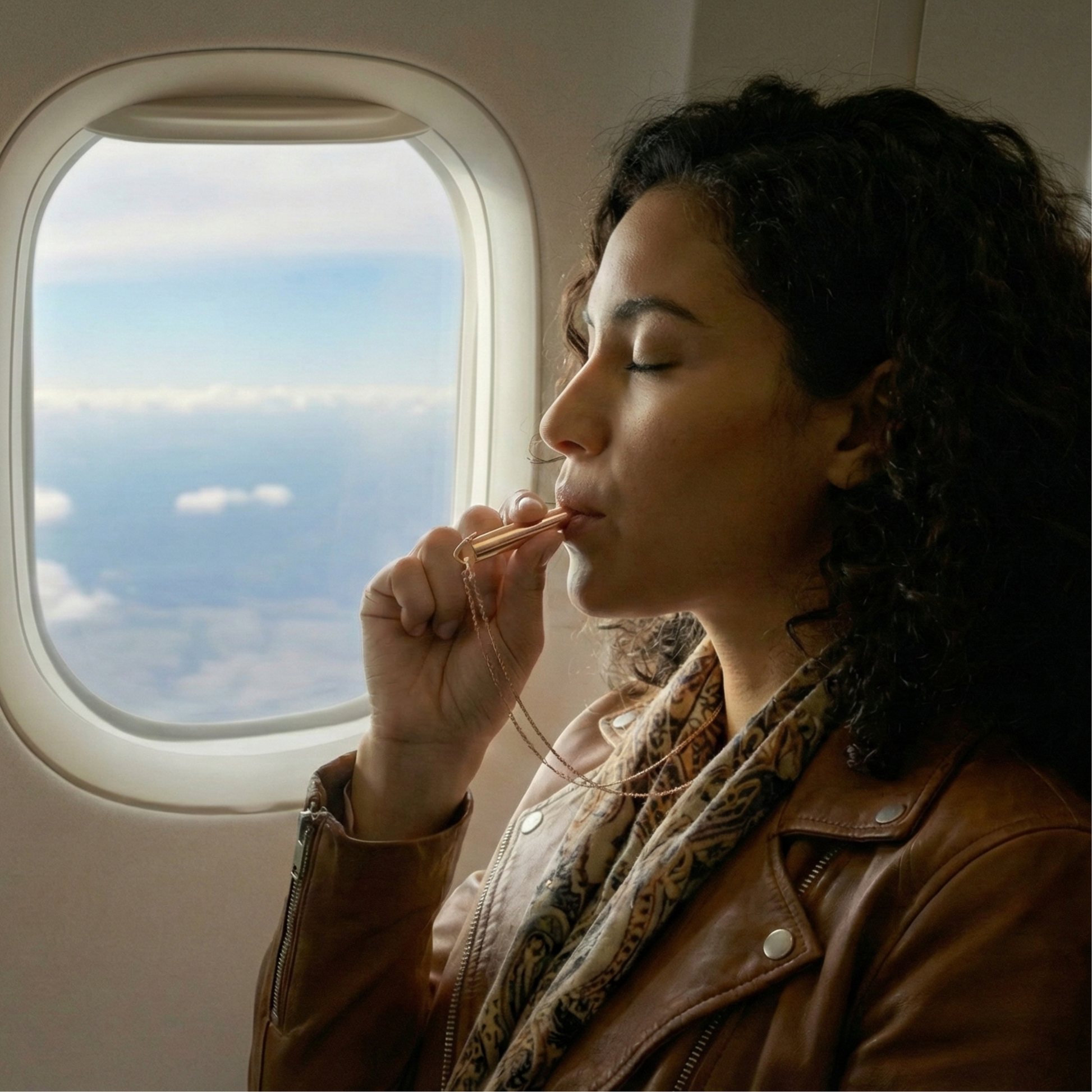 When the tightness starts — in a meeting, on a flight, at 3 AM — bring it to your lips and exhale slowly. The precision-engineered resistance naturally extends your breath to the 8-10 seconds that triggers your vagus nerve. No counting. No guessing.