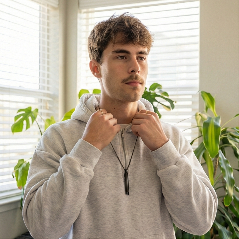 Slip it on like any other necklace. The weight on your chest is intentional — it's a constant, grounding reminder that relief is always within reach. No one will know it's anything more than a beautiful piece of jewelry.